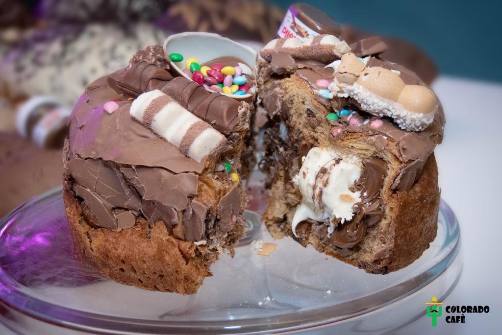 Prodotto da forno dolciario a pasta morbida con cioccolato al latte, cioccolato bianco, nutella e copertura di cioccolato al latte. Ingredienti: Ingredienti: Farina di grano tenero tipo 00, latte, uova, zucchero, miele, tuorli, burro, lievito madre (contiene glutine), cioccolato al latte (12%) (pasta di cacao, zucchero, burro di cacao, emulsionante: lecitina di soia, aroma naturale: vaniglia), cioccolato bianco (10%) (zucchero, burro di cacao, latte in polvere, emulsionante: lecitina di soia, aroma naturale: vaniglia), nutella (10%) [zucchero, olio di palma, nocciole (13 %), latte scremato in polvere (8,7 %), cacao magro (7,4 %), emulsionante: lecitina di soia, vanillina].